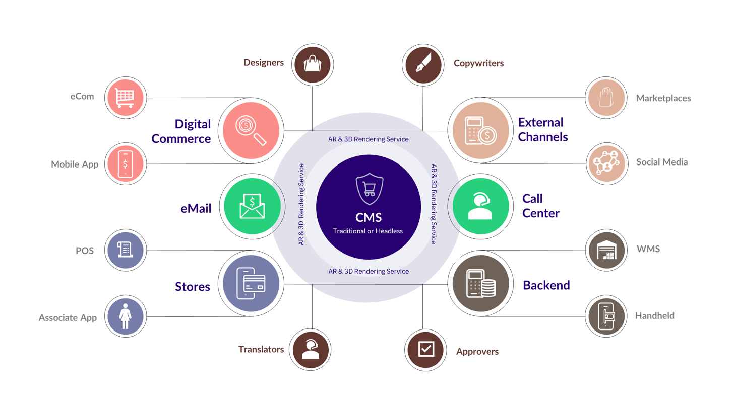 The following illustration showcases a simple 3-Dimensional rendering service that wraps around a traditional or headless content management system and can deliver immersive content to everyone in the retail ecosystem.