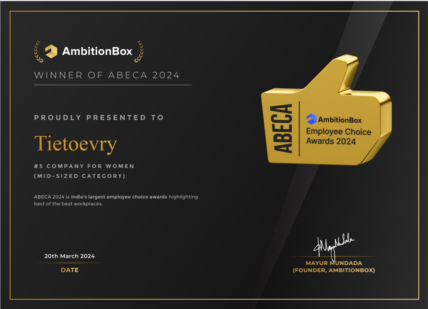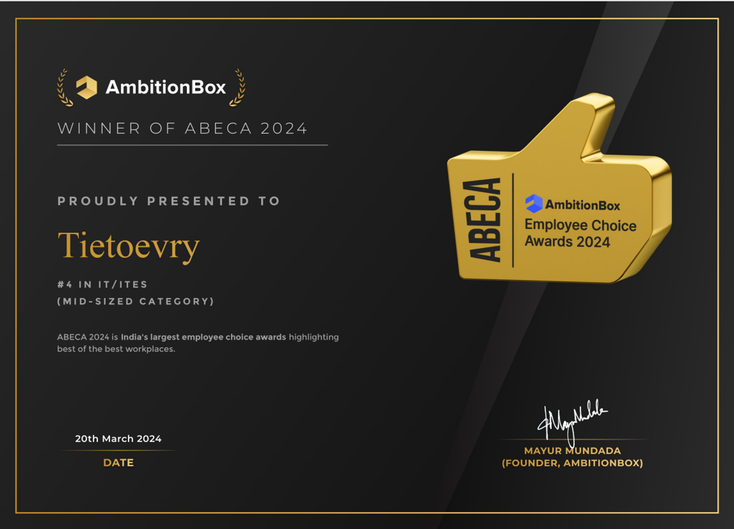 This recognition stands as evidence of our commitment at Tietoevry India to keeping employees at the forefront. The ABECA award is a distinction achieved by only 0.1% of companies, and significantly because it is made possible by our valued employees. Last year, AmbitionBox had also awarded Tietoevry India the 'Highly Active Companies' badge showcasing our collective commitment to active industry engagement.These awards are an annual list curated by AmbitionBox where companies are ranked based on the ratings and reviews received from current and former employees.